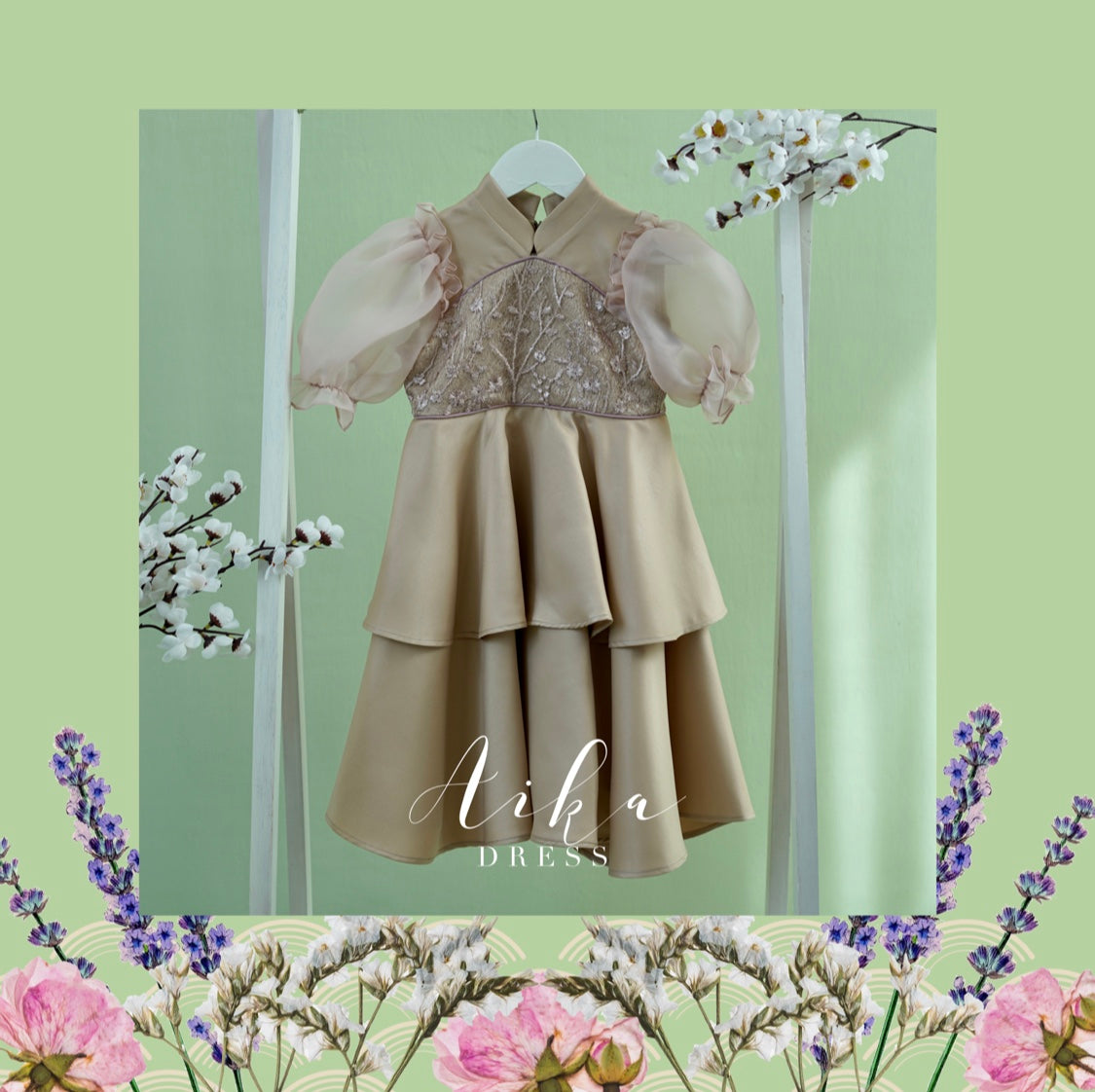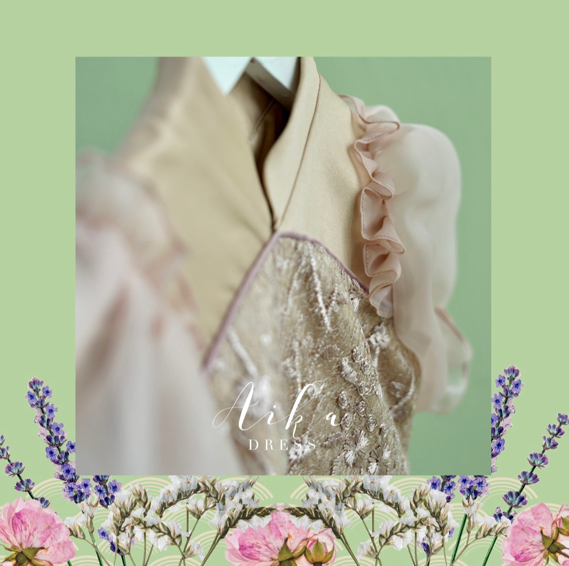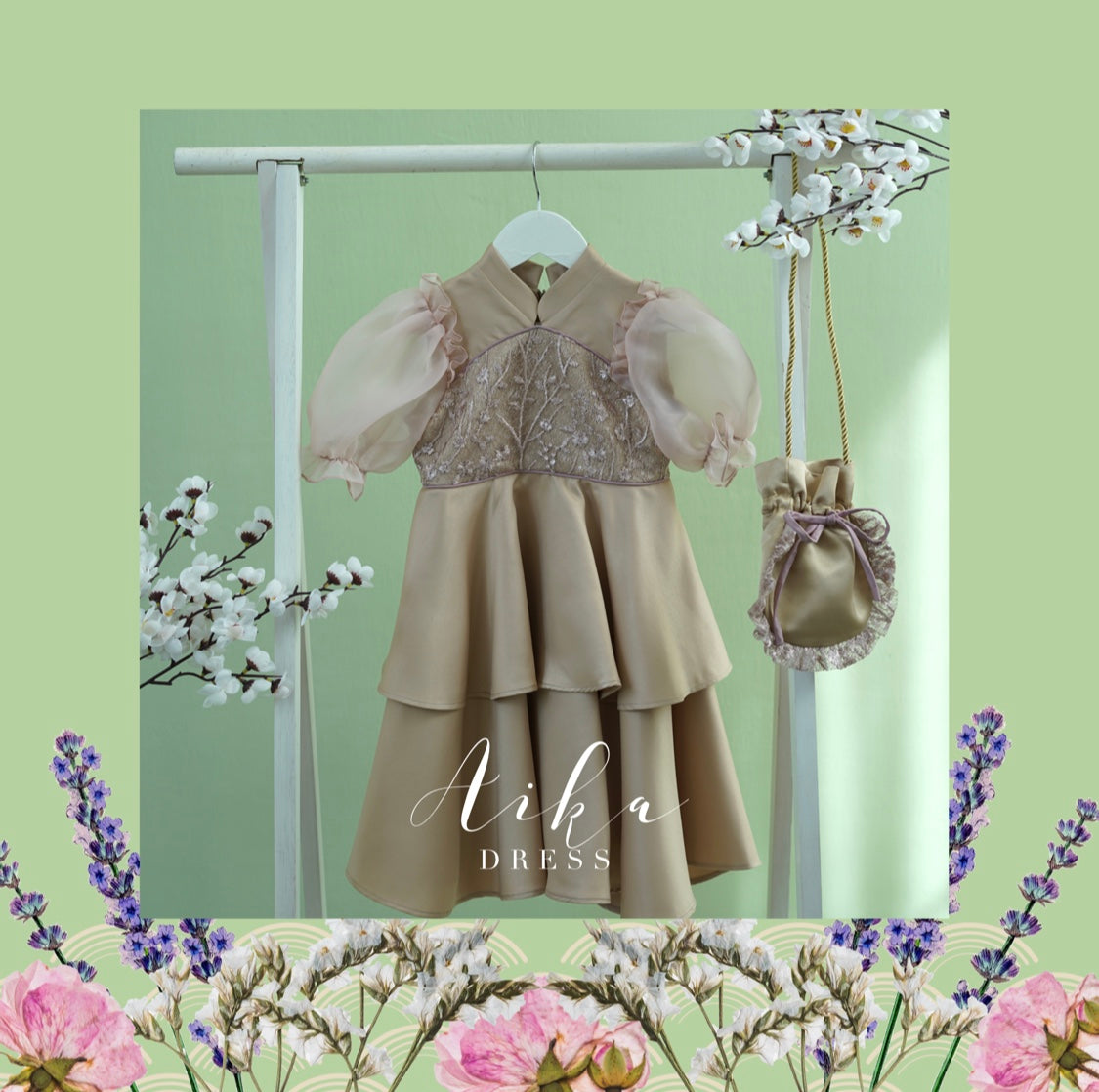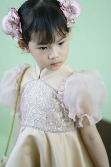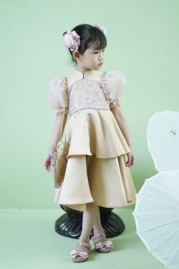 This dress has the perfect oriental cutting and the skirt has beautiful flare to be twirled by your little princess. it has dreamy puffy sleeves. Fabricated in premium satin,organza, embroidered tulle. It has zipper closure at the back. it comes with ang bao sling bag.