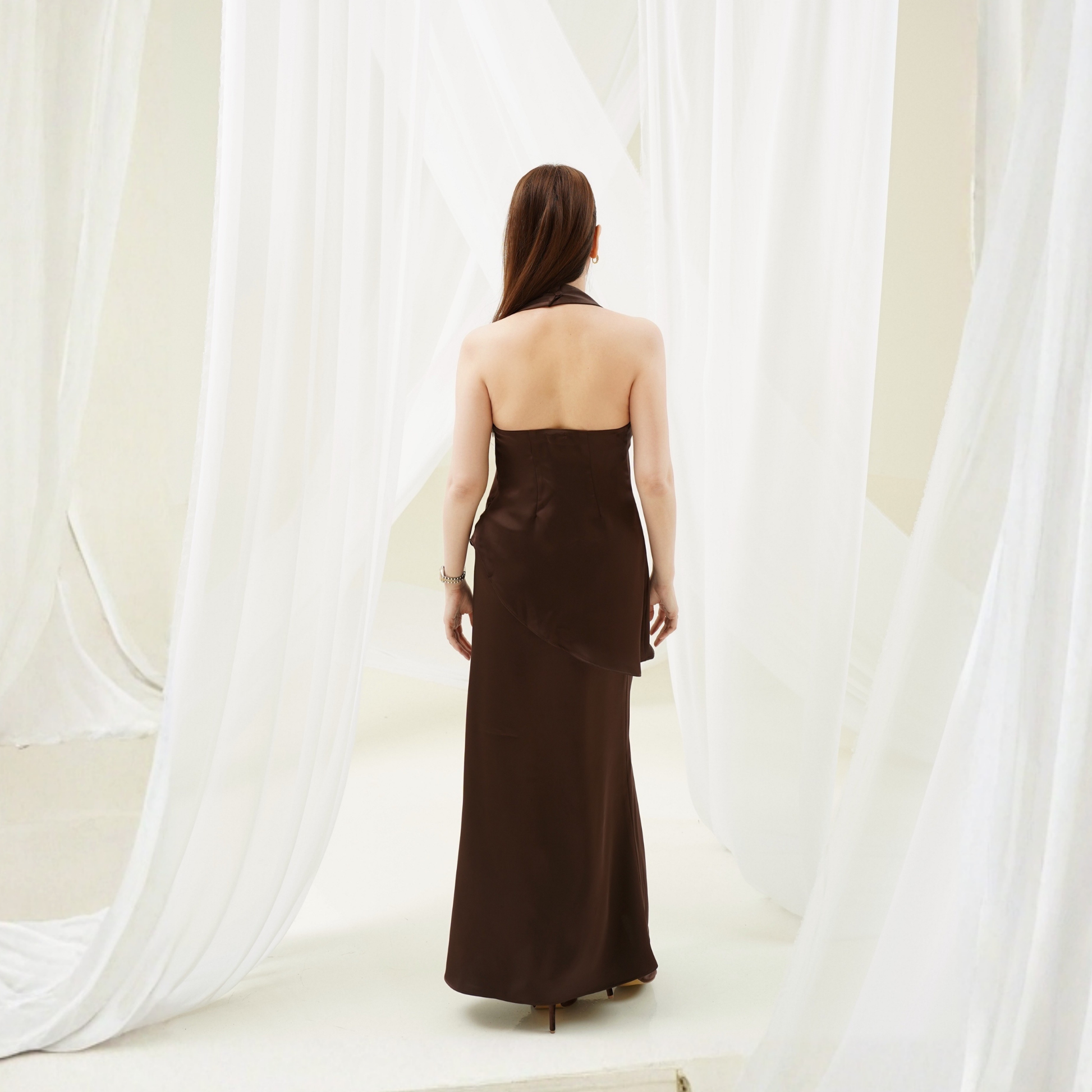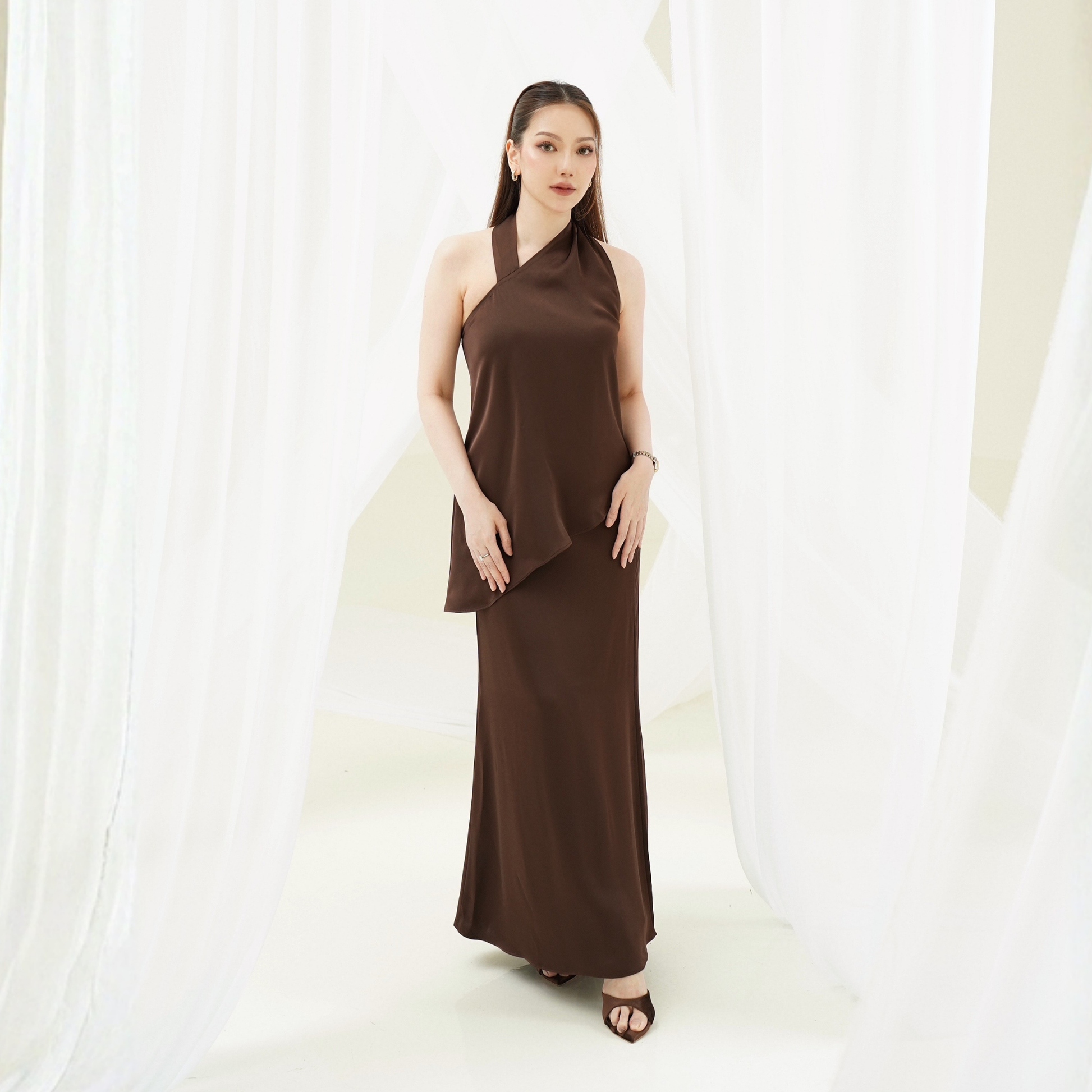 Comes in Ivory & Mahogany. A halter-style top with an asymmetrical cut that beautifully frames the shoulders. Made from soft silk that drapes perfectly on the body. Refined yet bold, an instant statement for any look.