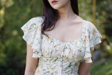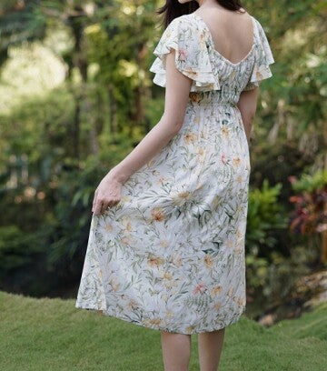 Made with the most premium 100% ORGANIC COTTON. The dress with the best cutting. Flare sleeve, ruched bust, and sweetheart neckline. Flattering, and the cascade print is just too gorgeous.