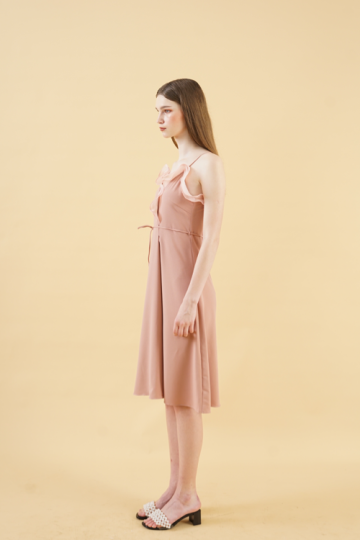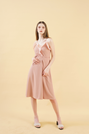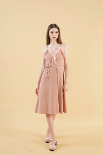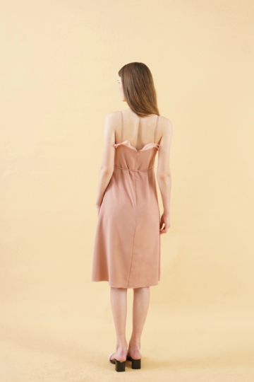 Effortless but stunning. A perfect cut of camisole A line dress with ruffles details at the wrap neckline. it has back zipper closure.