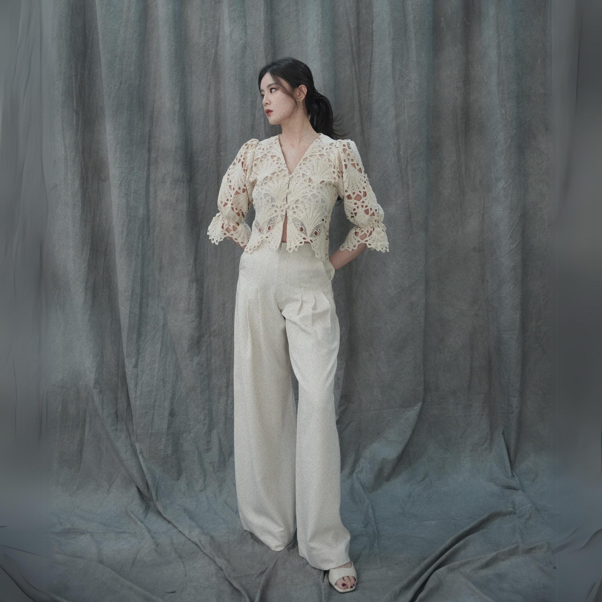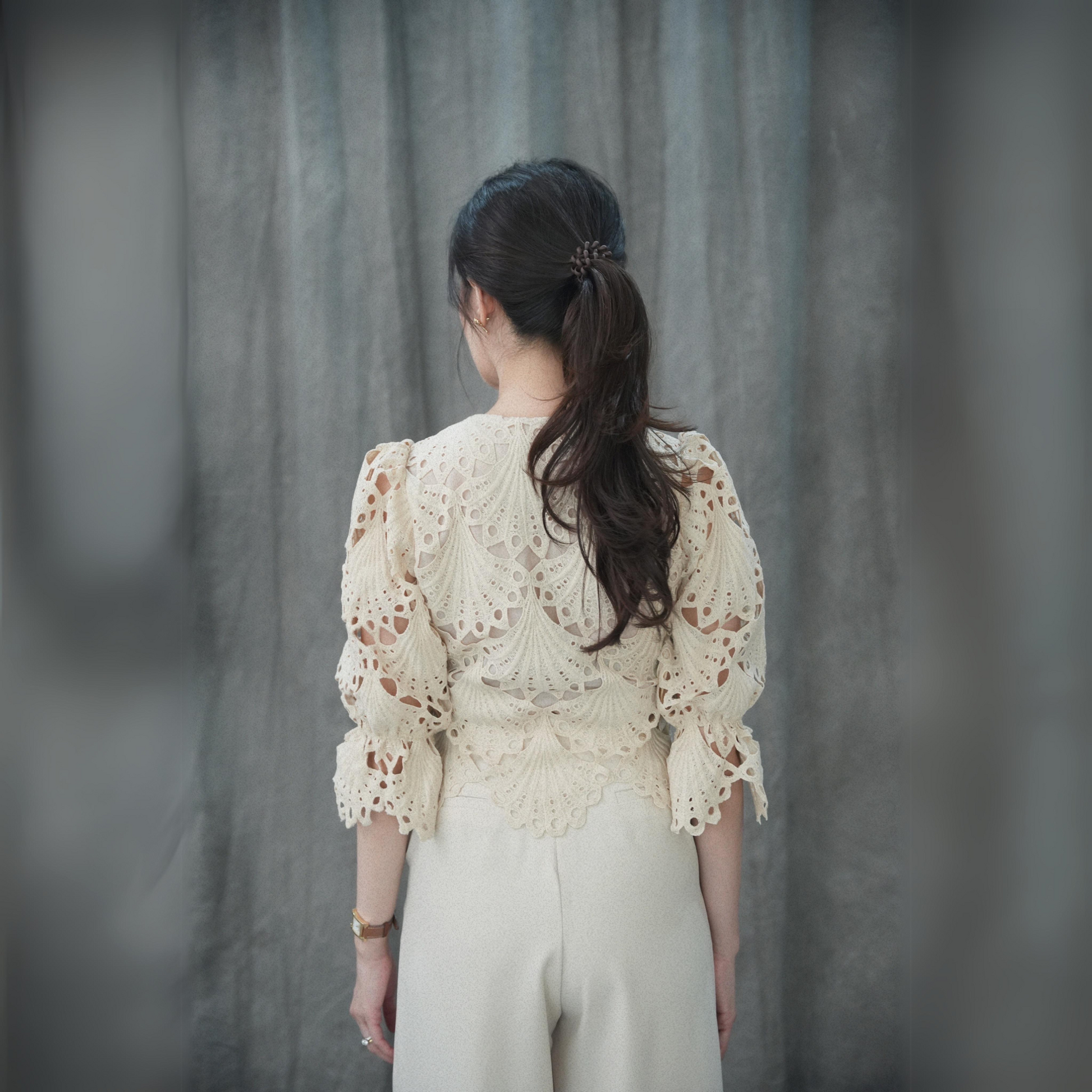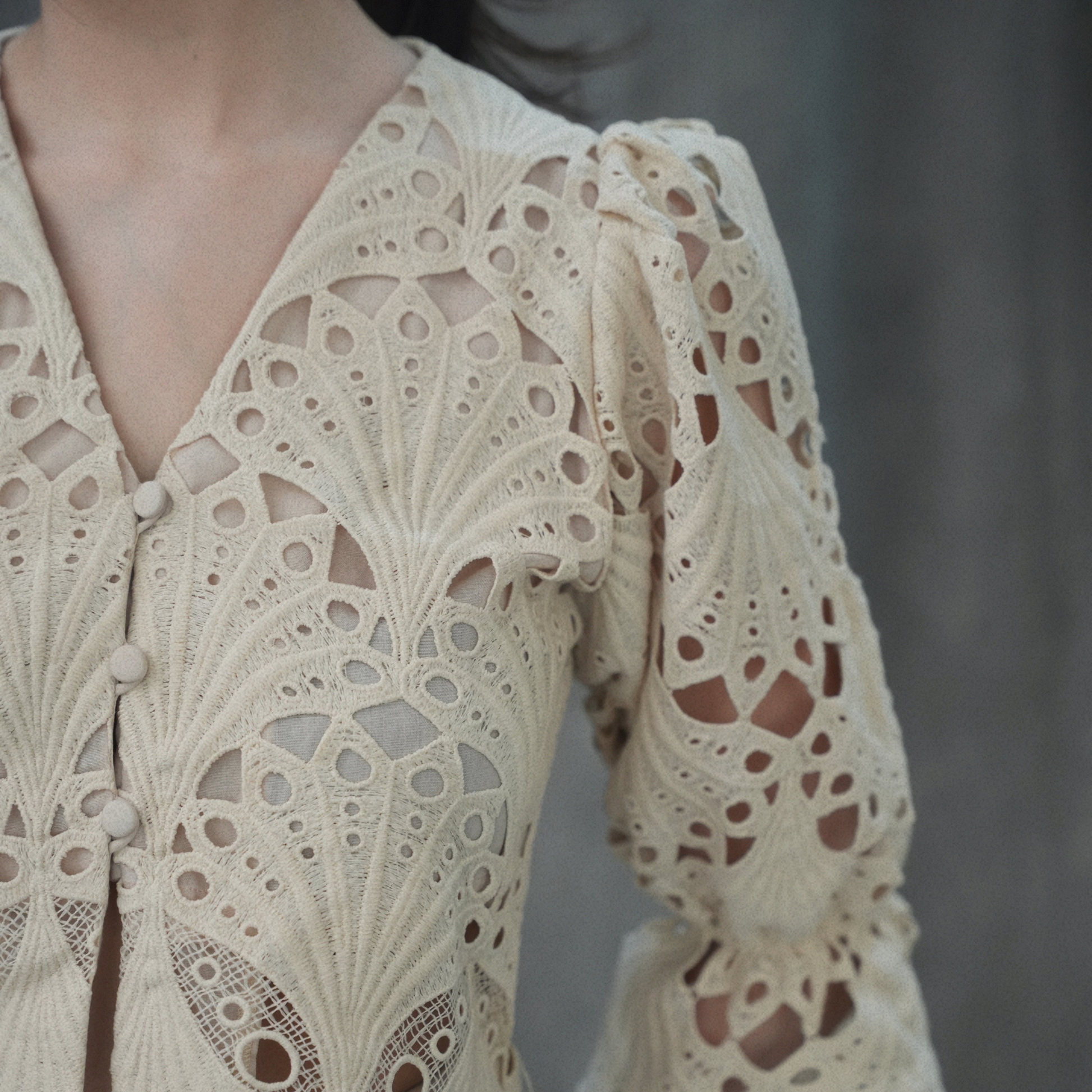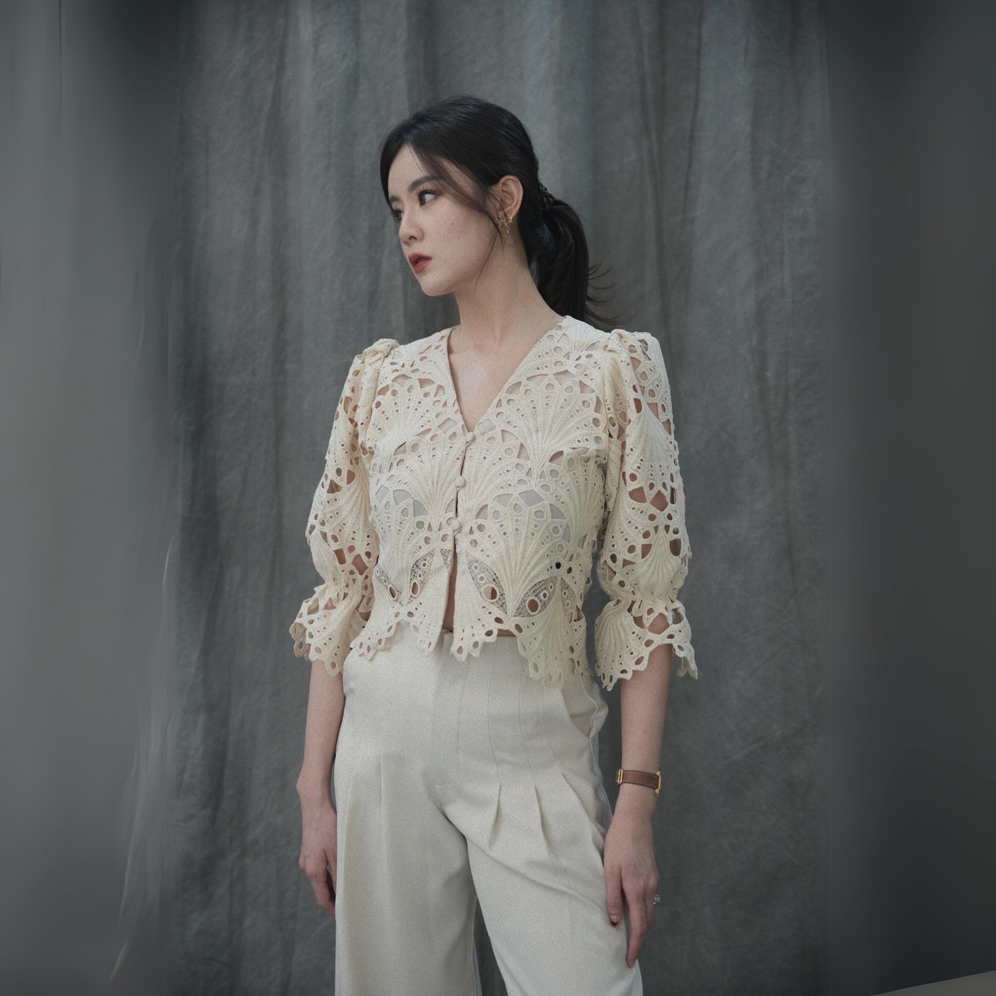 Fully embroidered. Super duper premium, very pretty and the brown color just simply elevates the skin tone . This Dominic top is a limited design so if it runs out, it's gone. The cutting is super timeless and easy to be styled. There is also a lining so it won’t see through.