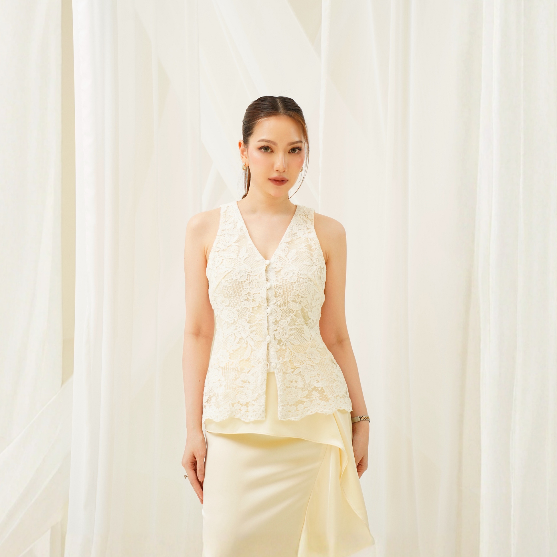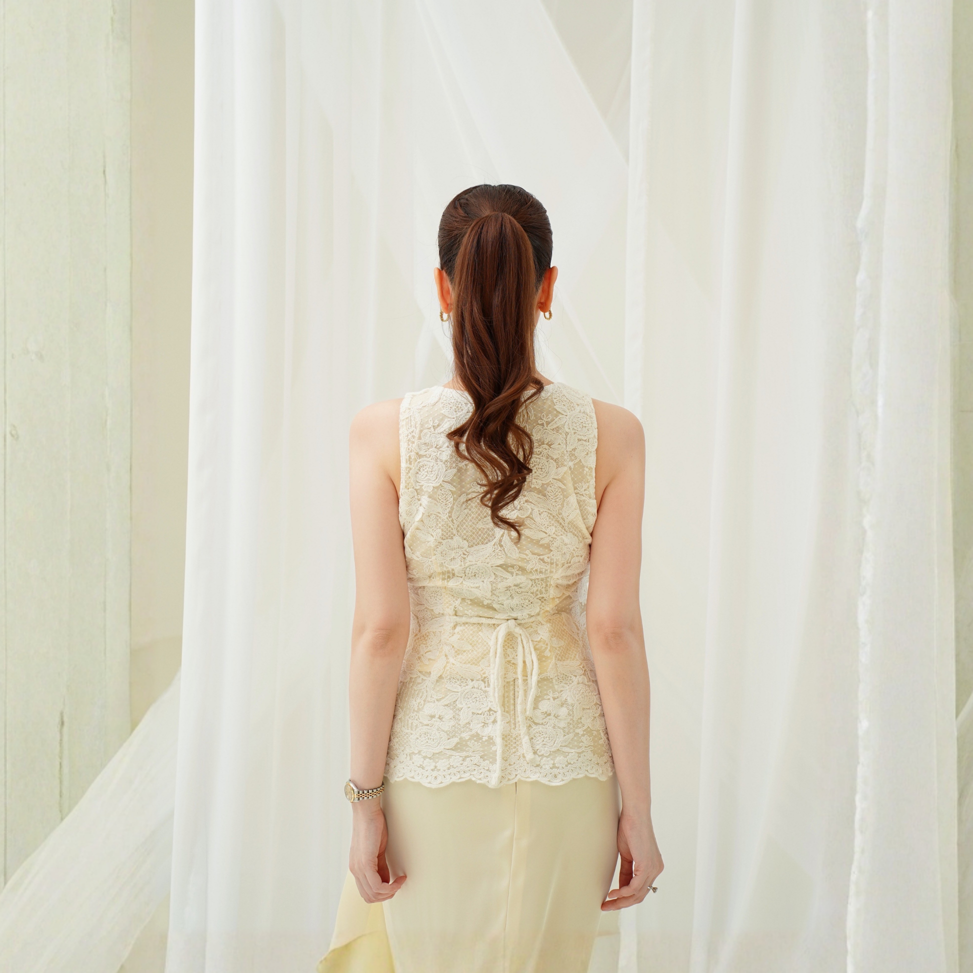 The sweetest lace vest top; soft, delicate, and beautifully detailed. The lace is intricate yet refined, giving a subtle romantic touch to any look. Pretty, versatile, and quietly luxurious.