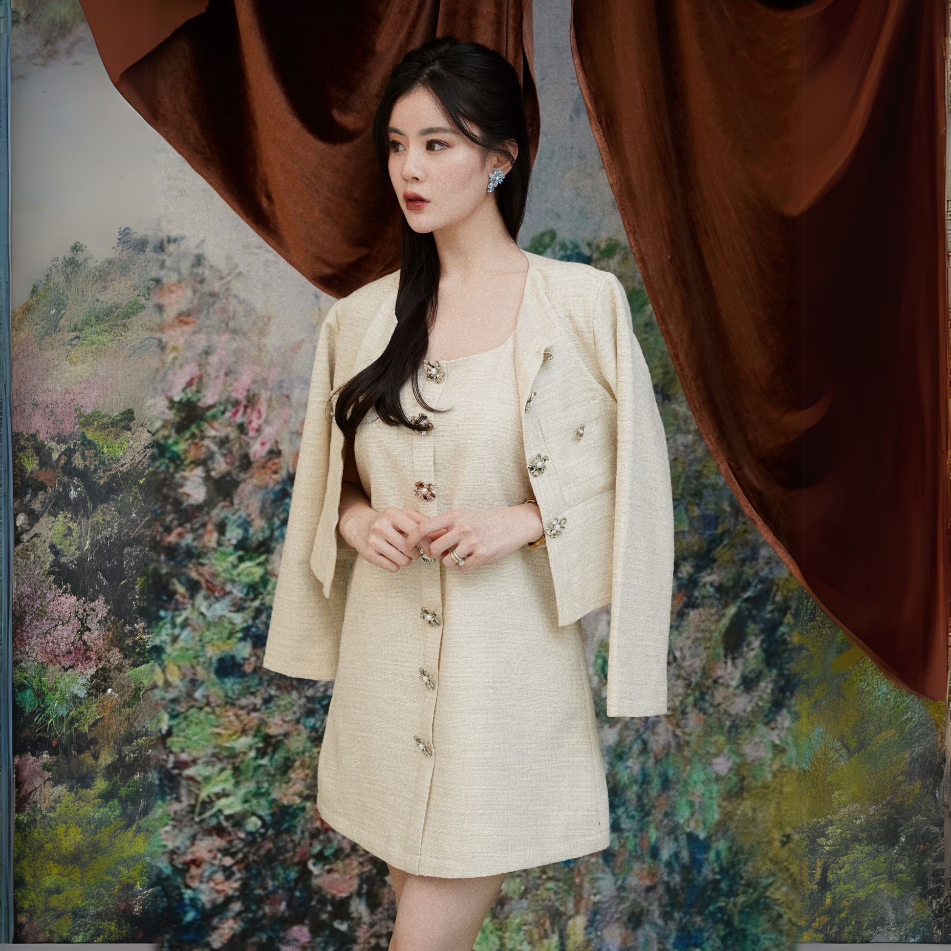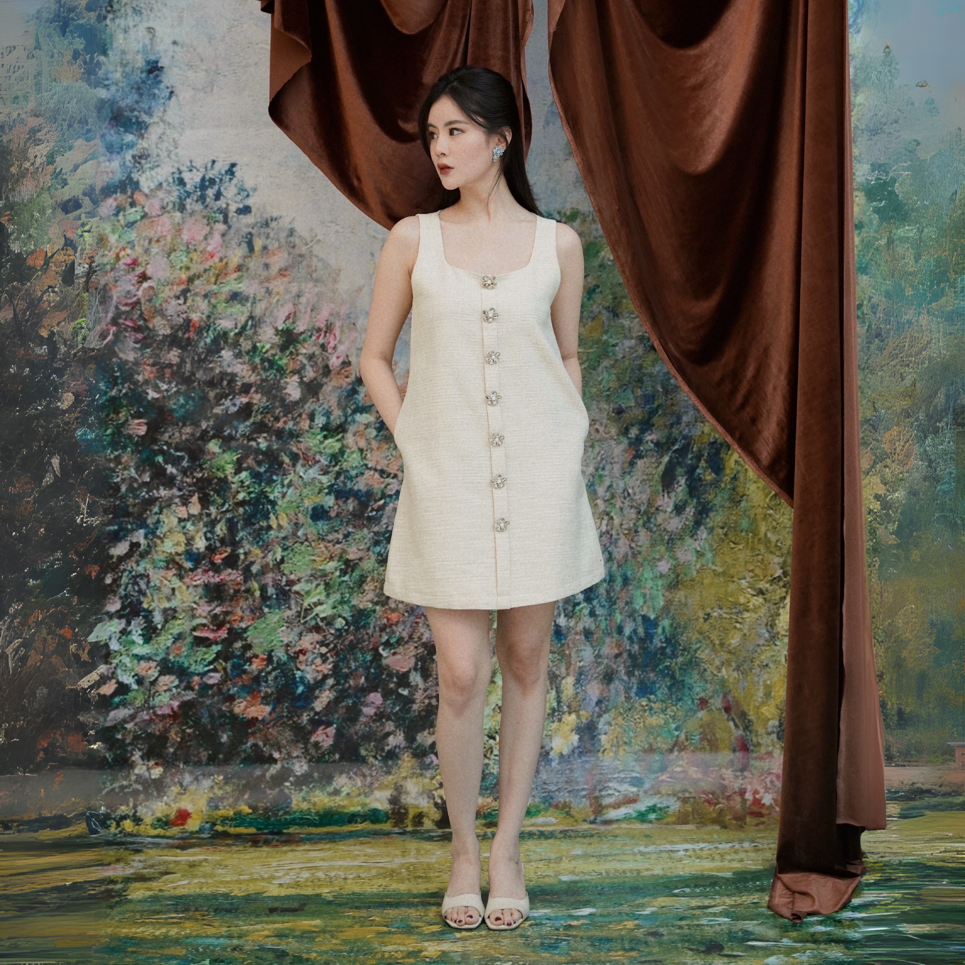 The definition of a simple stunning festive dress, the fabric is super beautiful — premium tweed. The buttons are luxurious, and the cut is just perfect. For lovers of Ivory or Cream hues, this is a must have. The vibe is very aesthetic. This tweed fabric and the buttons are absolutely perfect together, giving classic elite looks.