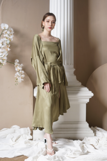 this gorgeous set includes outer, inner dress, belt, and scrunchie, which the cuttings are so lovely and it has rubber at the back to ensure the perfect fit. it has side pockets, flattering slit, and zipper closure at the back. Fabricated in luxurious glossy viscose that is super comfortable to wear anywhere you wish