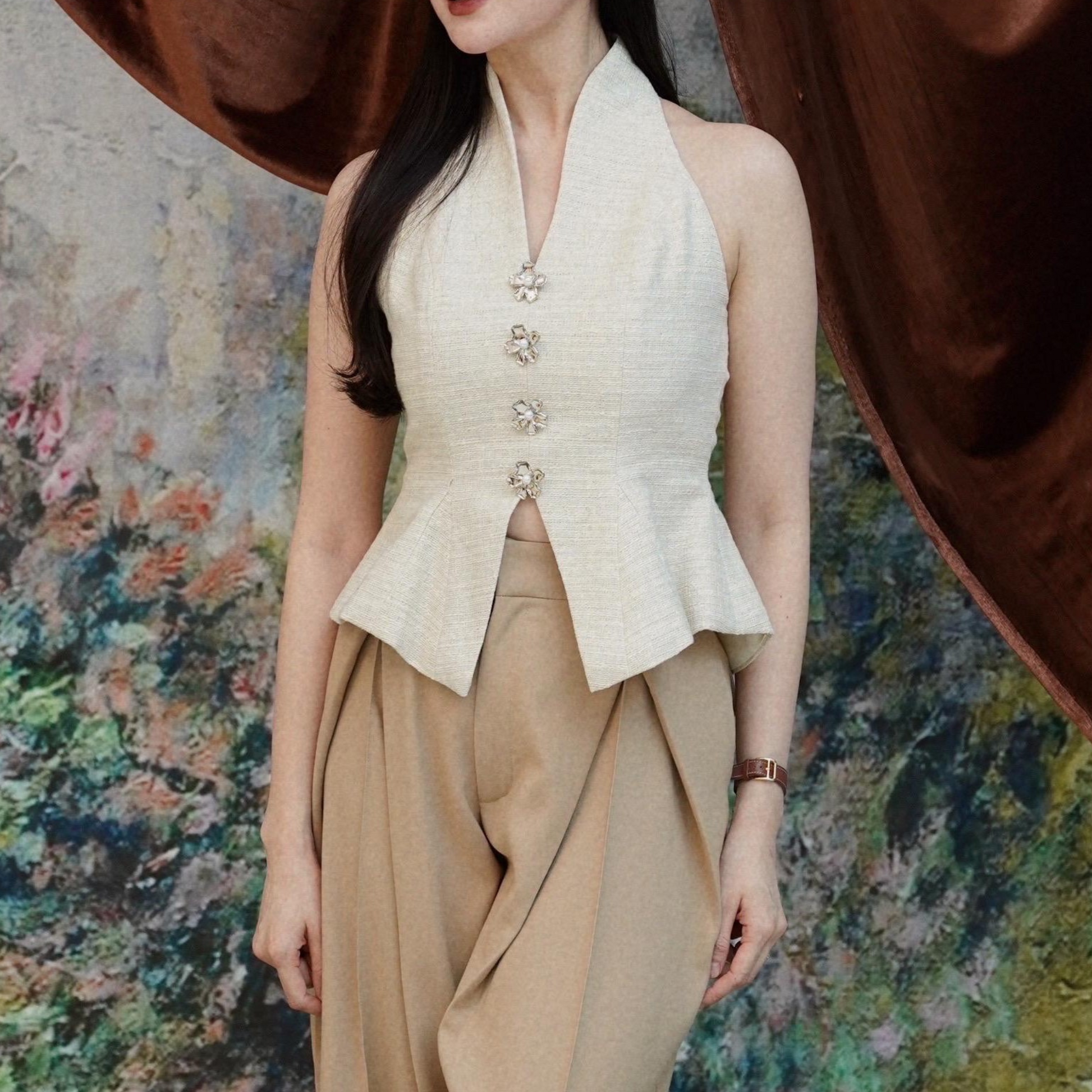 Available in two colors: Ivory and Starlight. Another beautiful top for festive occasions, great for Christmas or CNY. The cut is amazing, and the V-neck elongates the neck without being too revealing. The collar is versatile and can be styled in two ways. If you’re unsure, just close your eyes and pick — you won’t regret it because both are gorgeous. The metallic thread is perfect for festive occasions.