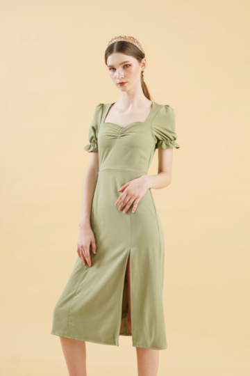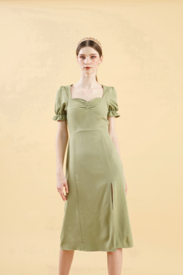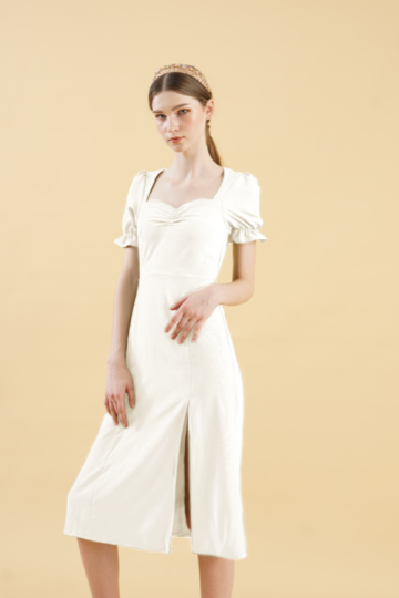 This kind of dress will absolutely in top list of your wishlist! with a heart neckline and gathered fitted bodice, feminine puff sleeves and a flattering high front split. it has back zipper closure. it comes with premium lining too!