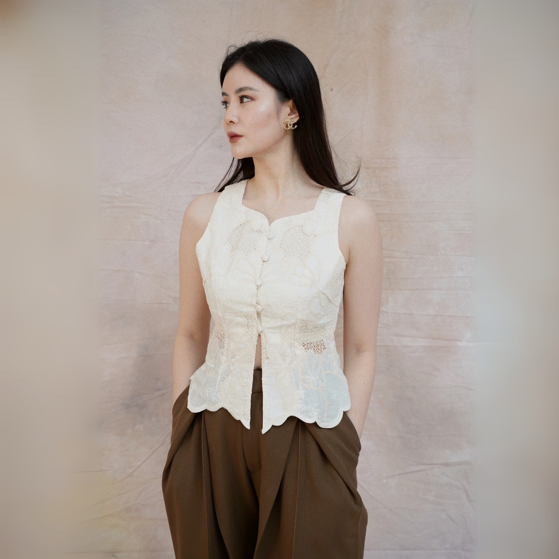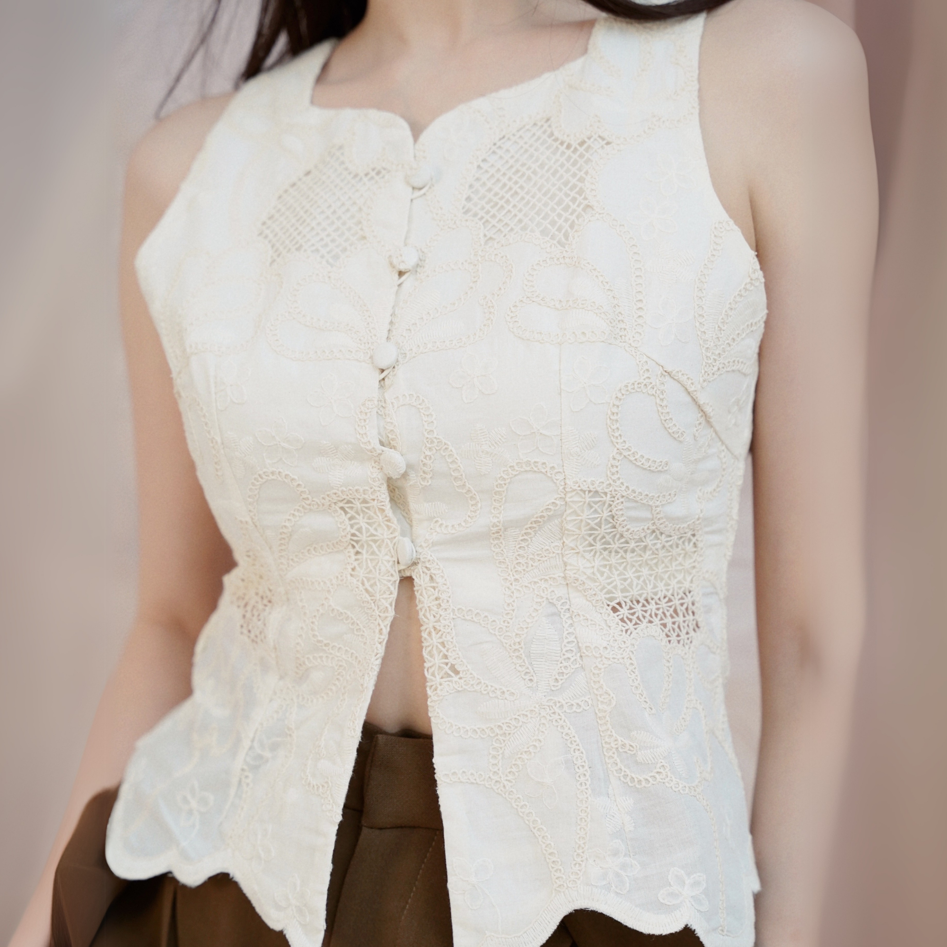 “This season’s showstopper! Every detail and finish speaks of perfection. Designed like a chic vest top, it features a uniquely shaped neckline—reminiscent of a sweetheart style but modestly elegant—and delicate button accents. With its flattering silhouette, it provides an instant slimming effect that outshines even a corset. A true masterpiece for your wardrobe!”