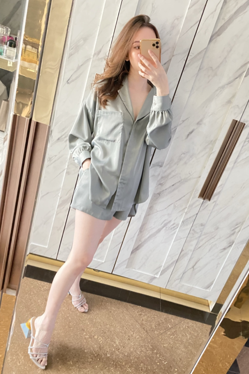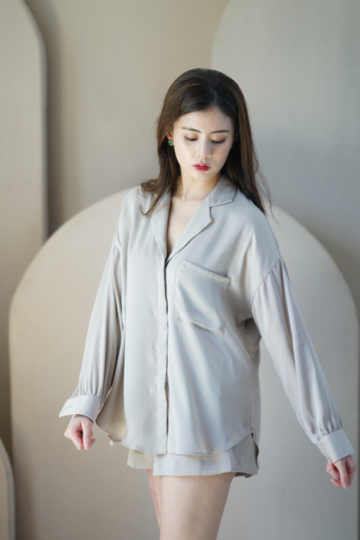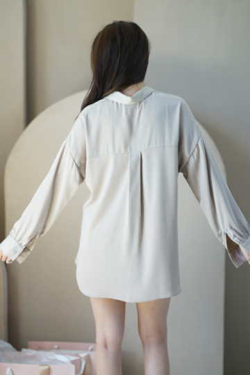 fabricated in the most luxury satin, that gives you cooling effect when you wear it, the shine on the fabric is not too much, so it's perfect to be worn daily. and it's such a versatile piece that you can wear them together or separated. it comes in gorgeous champagne nude colour that you'll love.