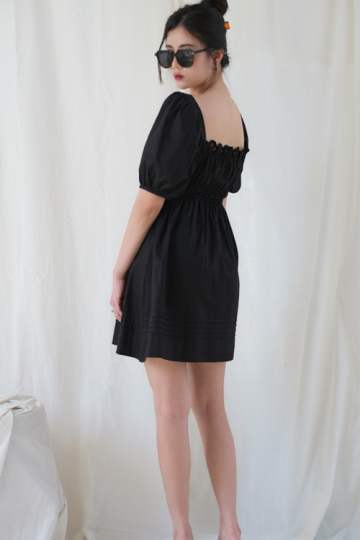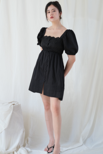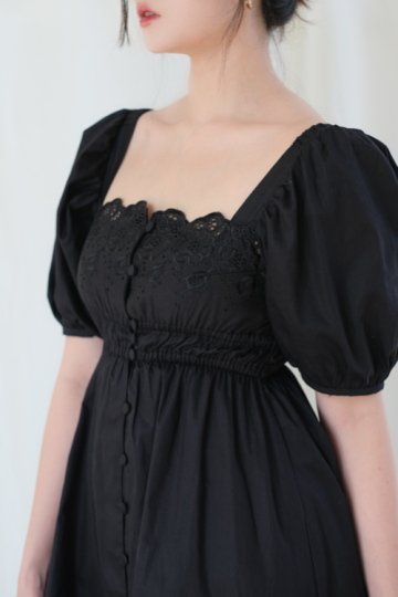 this dress is such a divine dress to have in your closet, as it features all the gorgeous details, such as premium embroidery, pleated waist, and adorable puffy sleeves. it has elastic as the back to ensure the perfect fit. Fabricated in comfy cotton. It has pocket and wrap button as the front closure.