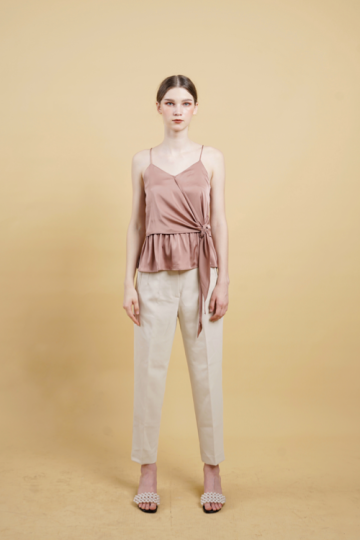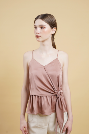 a flattering cami top in a satin finish featuring a wrap tie front and gathers details underneath the wrap. it comes with adjustable spaghetti straps.
