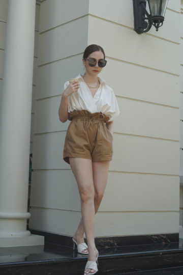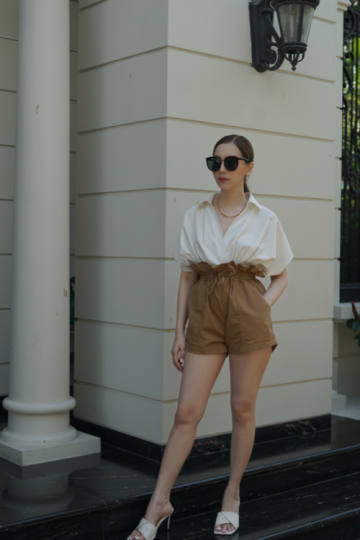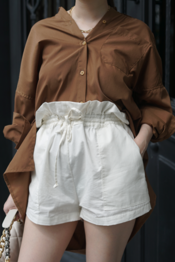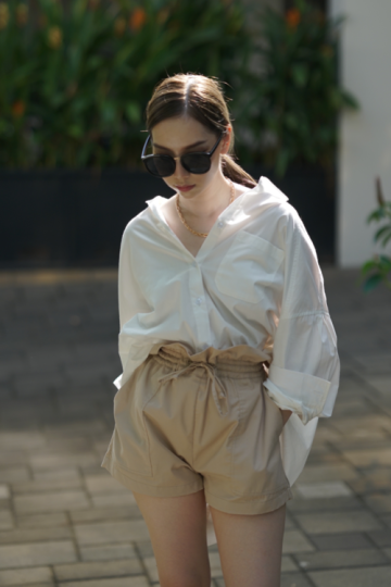 Oslo shorts is the kind of daily basic shorts that you must have! the cutting is well made to ensure it fits perfectly to your body. it has elastic waist band on the back and adjustable drawsting at the front. it comes in to 3 gorgeous neutral color. Must have!