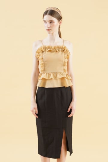 the flirty cami top with adorable ruffles details, perfect for Summer! it comes with adjustable spaghetti straps.